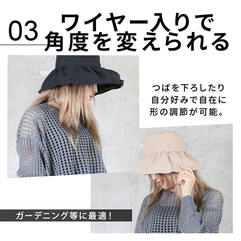 焼けたくないときの必需品、この紫外線カット帽子は、オシャレしながら紫外線からしっかり守ります。つば広のデザインで顔回りからうなじまでカバー。ワイヤー入りで角度の調節が可能で、お好みの形に変えられるのが特徴です。
