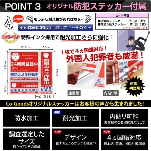 ◆ 防犯ステッカー (※厳しい条件下で使用試験済) は厳選したサイズ&デザインと特別開発した仕様を採用。内貼り用(市場初)は二階の窓等に内側から外に向けて貼れます。