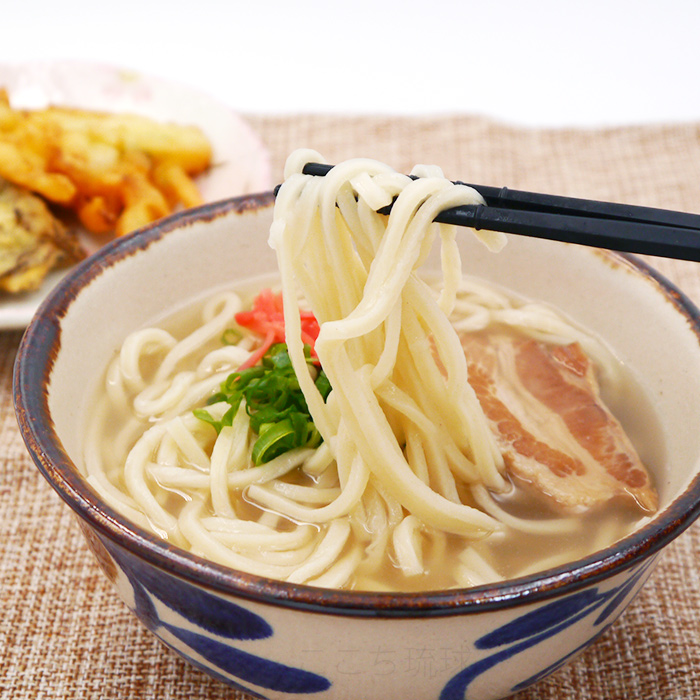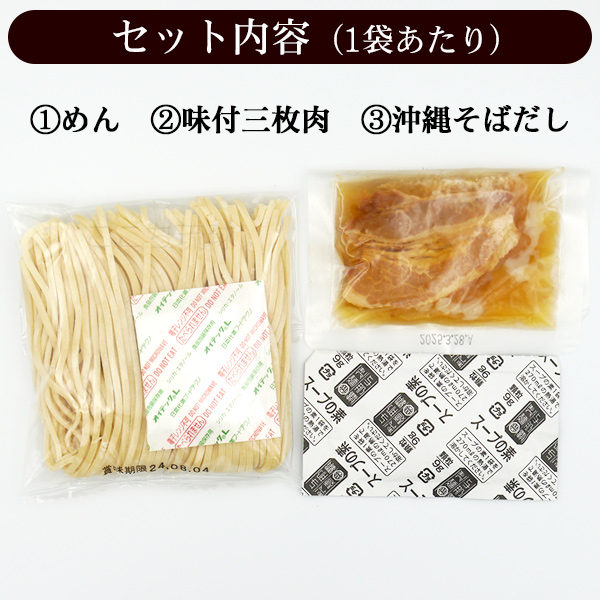 ■原材料名:めん[小麦粉、酒精、食塩/プロピレングリコール、かんすい、pH調整剤、ソルビトール]、味付三枚肉[豚バラ肉、しょうゆ(大豆、小麦を含む)、砂糖、食塩/調味料(アミノ酸)]、沖縄そばだし[食塩、乳糖、粉末醤油、ポーク香味調味料(ポークエキス粉末、麦芽糖、デキストリン、食塩、砂糖、その他)、かつおぶし粉末、砂糖、ポークエキス粉末、酵母エキス、香辛料、でん粉、こんぶ粉末/調味料(アミノ酸等)、香料、(一部に乳成分・小麦・大豆・鶏肉・豚肉を含む)]