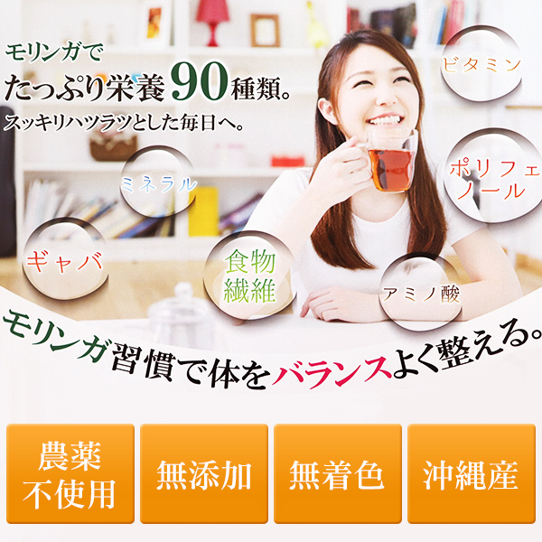 モリンガは健康食品として注目されているスーパーフードで、ビタミン、必須アミノ酸、ポリフェノール、ギャバ、食物繊維など90種類以上ともいわれる豊富な栄養素を含んでいます。