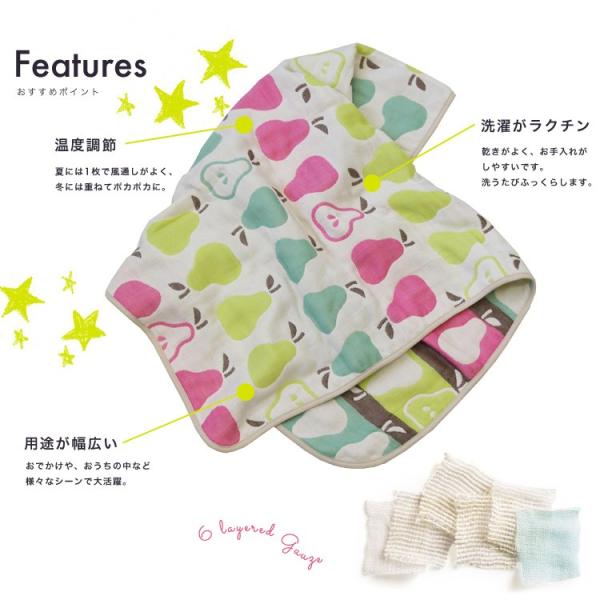 自宅で気軽に洗濯でき、清潔に保ちやすい綿100%のガーゼをガーゼケットです。扱いやすさだけではなく、機能面でも吸水、速乾に優れ、赤ちゃんのお世話に最適といえる自然素材です。 6枚のガーゼを丁寧に重ねて織り、肌あたりはより柔らか。 赤ちゃんだけではなく、パパもママも実感できる気持よさです。