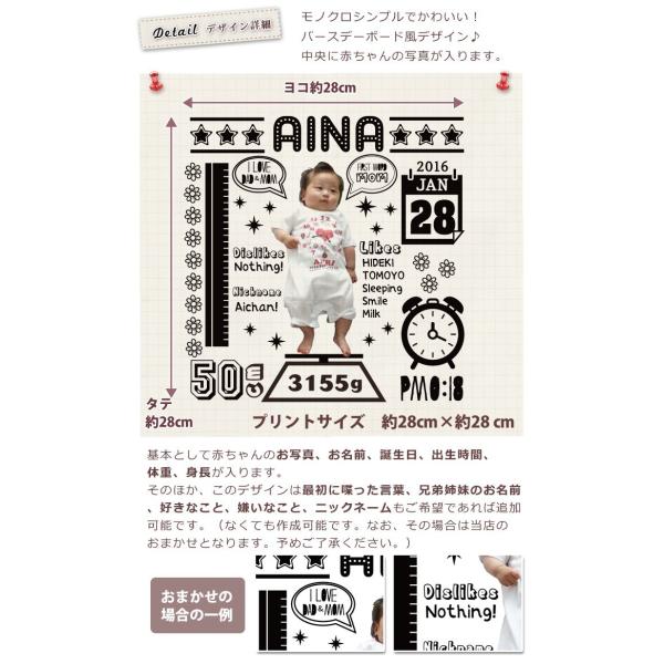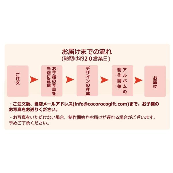 アルバムの表紙に「赤ちゃんの写真」「赤ちゃんのお名前」「出生時間を示した時計・数字」「生年月日」「出生身長」「出生体重」他、「ニックネーム」「好きなこと、嫌いなこと」「ご兄弟姉妹の名前」などを名入れするオーダーメイドのアルバムです。