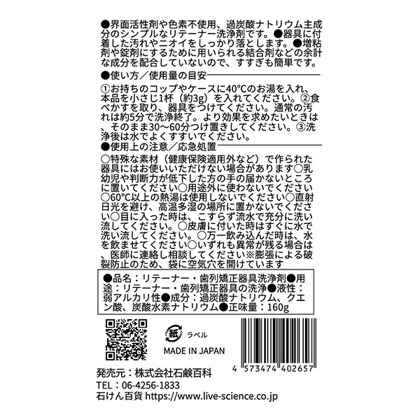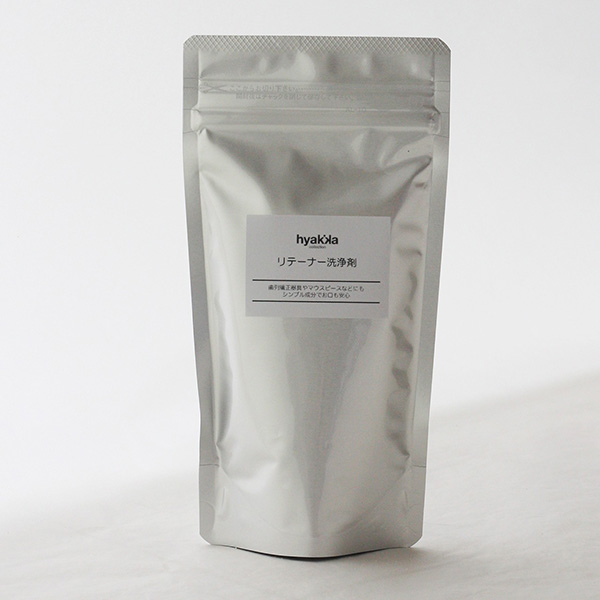 「リテーナーやマウスピース、歯列矯正器具の洗浄剤には『石けん百貨入れ歯洗浄剤』を!」とお勧めし、その後、たくさんの商品レビューとともに、名称を変えて販売してほしいという要望をたくさんいただいての、商品化です。大変お待たせしました。また、ご要望をありがとうございました。
