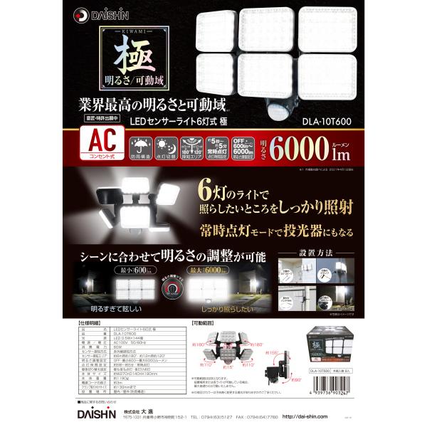 センサーライト 屋外 LED 明るさ 最強 コンセント 防犯 人感 玄関 灯 明暗センサー AC 野外 防水規格 防雨型 駐車場 自動点灯 DLA-10T600