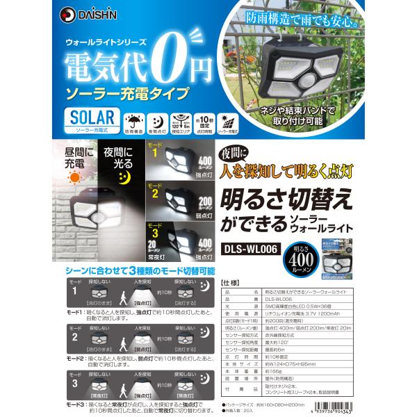 強点灯 400Lm 弱点灯 200Lm 常夜灯 20Lm