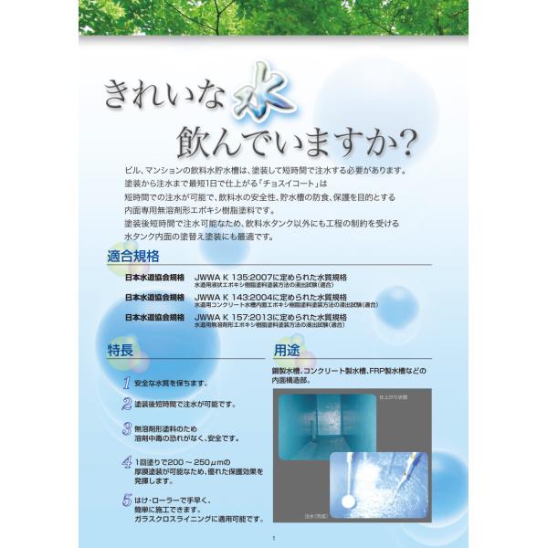 チョスイコートは短時間での注水が可能で、飲料水の安全性、貯水槽の防食・保護を目的とする内面専用無溶剤形エポキシ樹脂塗料です。