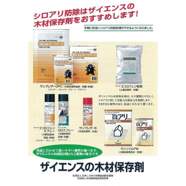 速効性・持続性に優れた防腐・防蟻剤です。木材表面に塗布又は吹き付けすることにより、シロアリなどの予防・駆除及び腐れに優れた効果を発揮します。木材に対し強い浸透性があり、長期間効力が持続します。色:オレンジ クリヤー グリーン ブラウン