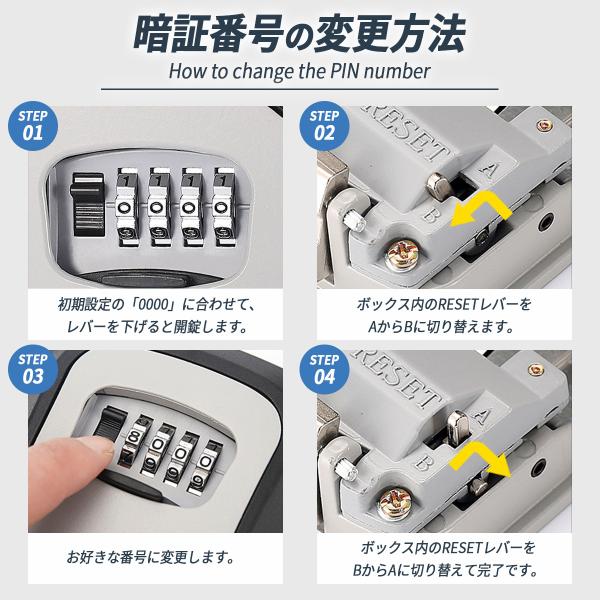 ・4桁のダイヤル式で10000通りの暗証番号が設定可能。何度でも番号変更が可能です。