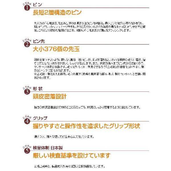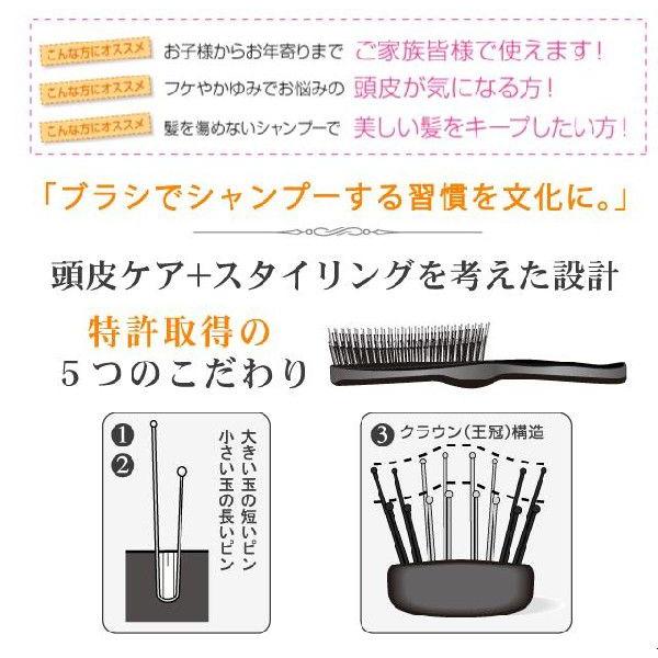 指先より細かくシャンプーできるこのブラシ、頭皮を傷つけないよう先が球状になったピンが植えられ、長いピンには小さな球、短いピンには大きな球という組み合わせが特徴です。