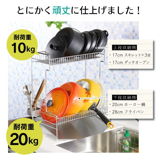 水切りカゴの一つ一つに太い線材を使用し、重い鍋やフライパンも収納出来るように頑丈に仕上げました。