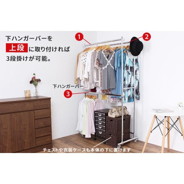 下ハンガーバーを2段階の上に取り付ければ、最大3段掛けハンガーラックにもなります。