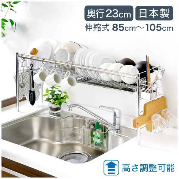 水切りラック シンク上 伸縮式 システム 2段 奥行23cm カゴ2 棚2 ステンレス製 水切りカゴ まな板収納 カトラリーケース 燕三条製 日本製 川口工器 22401