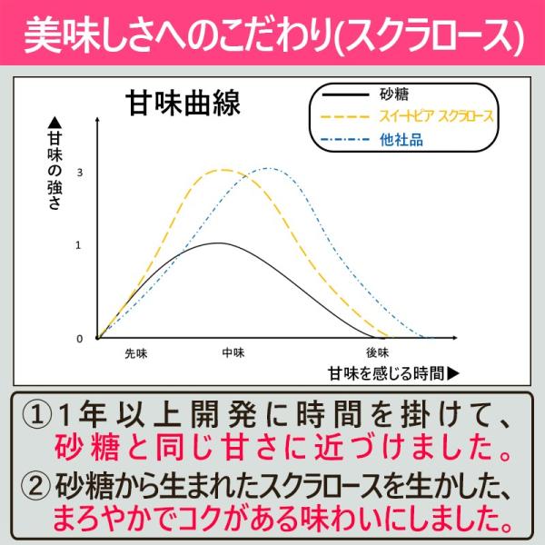 ぶとう糖を発酵して得られる糖質エリスリトールと、砂糖から生まれた砂糖に近い自然な甘みのスクラロースを原料としています。