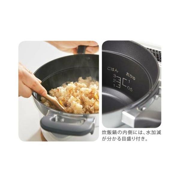 内側にはごはんが付きにくいフッ素加工を施し、便利な水位目盛付き。コンロが自動で火力調節し、炊きあがると自動で消火。ガス火炊きのふっくらごはんが楽しめます。炊き込みご飯にもおすすめ。