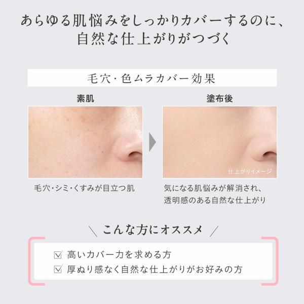 ・独自開発の“しっかりカバーパウダー”が、色ムラ・シミ・くすみを徹底カバーしながら、厚塗り感のない自然でヌードな仕上がりを実現します。