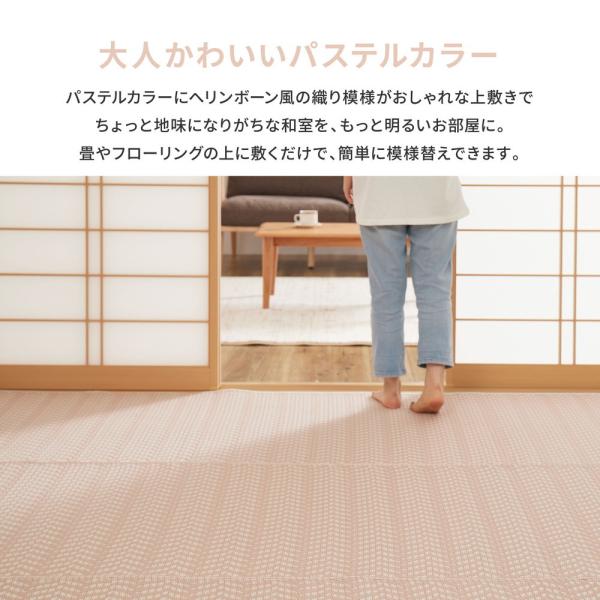 パステルカラーがかわいい、水洗い出来るPP素材のい草風カーペット。パイプの表面に筋が入っている筋入りパイプで、肌に密着しないからベタベタしにくく、汗ばむ季節にもおすすめ。また、パイプ内の空気層の保温効果で床からの冷気を防ぐため、寒い季節でもあたたかく過ごせます。