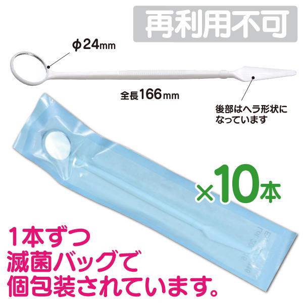 滅菌済で衛生的ハンドルはプラスチック製、ミラーはガラス製です。全長166mmミラーφ24mm後部はヘラ形状になっています。1パック10本(1本ずつ個包装)再滅菌不可
