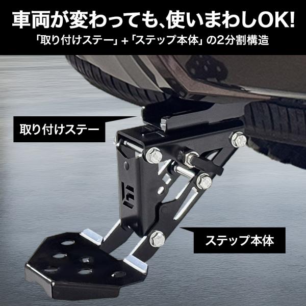 「ステップ本体+取付ステー」の2分割構造になっているので、取付ステーをそれぞれの車種に合った専用ステーに変更すれば、ステップ本体を付け替えて使いまわしが可能です。