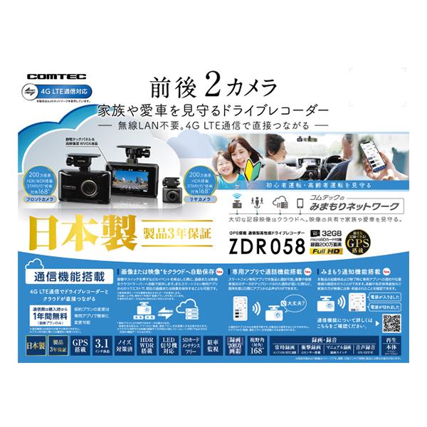 【即日発送!※特別価格 限定3台・新品未開封品・日本製/3年保証】●コムテック(COMTEC) 4G LTE通信、駐車監視対応 前後2カメラドライブレコーダー【ZDR058】●