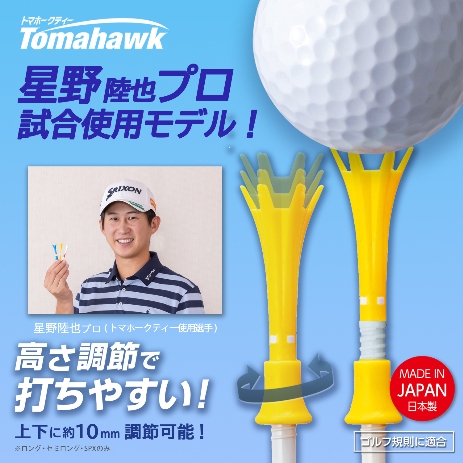 アジャスターを回して、1 本でティーアップの高さを上下に約10mm 調節が可能です。『トマホークティーロング』はティーアップの高さ40〜50mm、『トマホークティーセミロング』は高さ35〜45mm で設定できます。