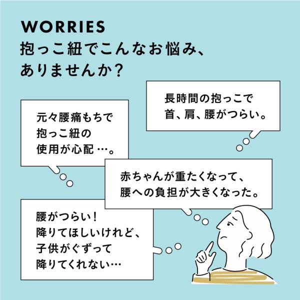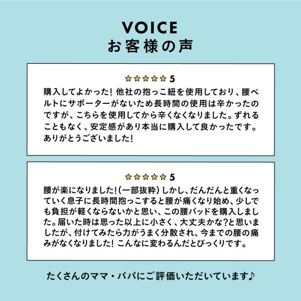 ぜひ、「抱っこ時間が楽しくなった」「腰痛が軽減されて、子供との時間をより楽しめるようになった」と言っていただける商品となっておりますので、ぜひお買い求めくださいませ!