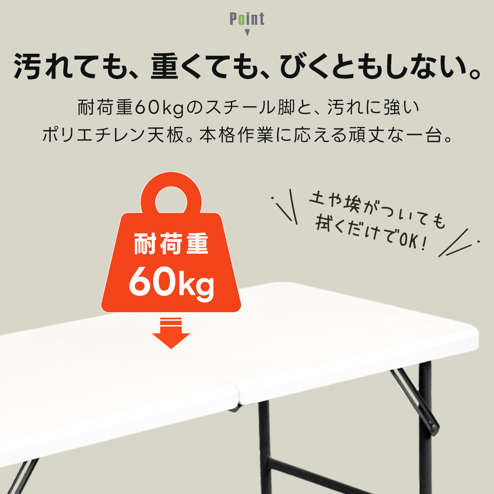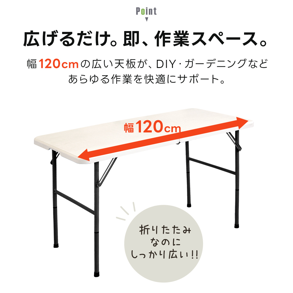 折りたたみ式で収納も楽々。幅約120cmの広い天板がDIY・ガーデニング・BBQなどあらゆる作業を快適にサポート。