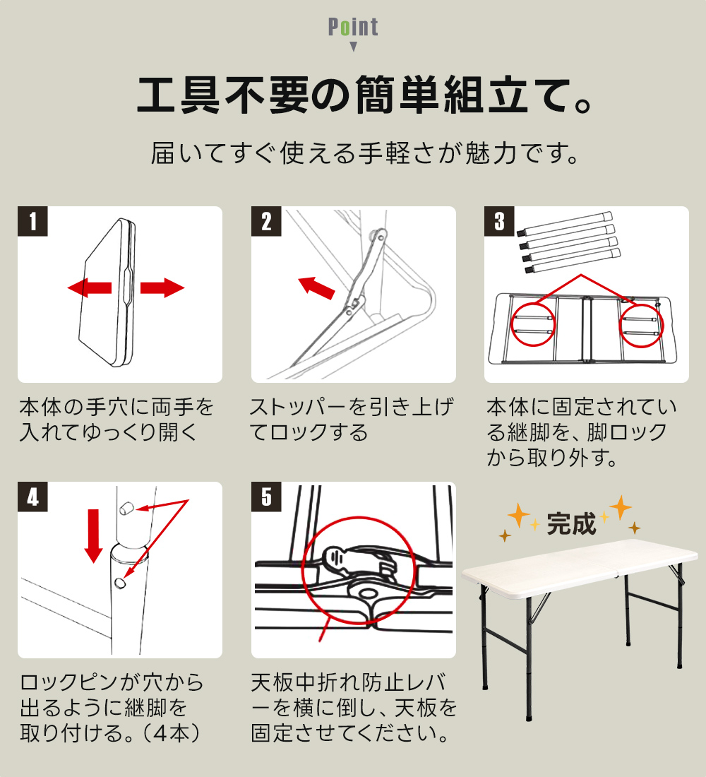 ※安全のため、使用時は必ず天板および脚部が固定されていることを確認し、無理な力を加えないようお気をつけください。