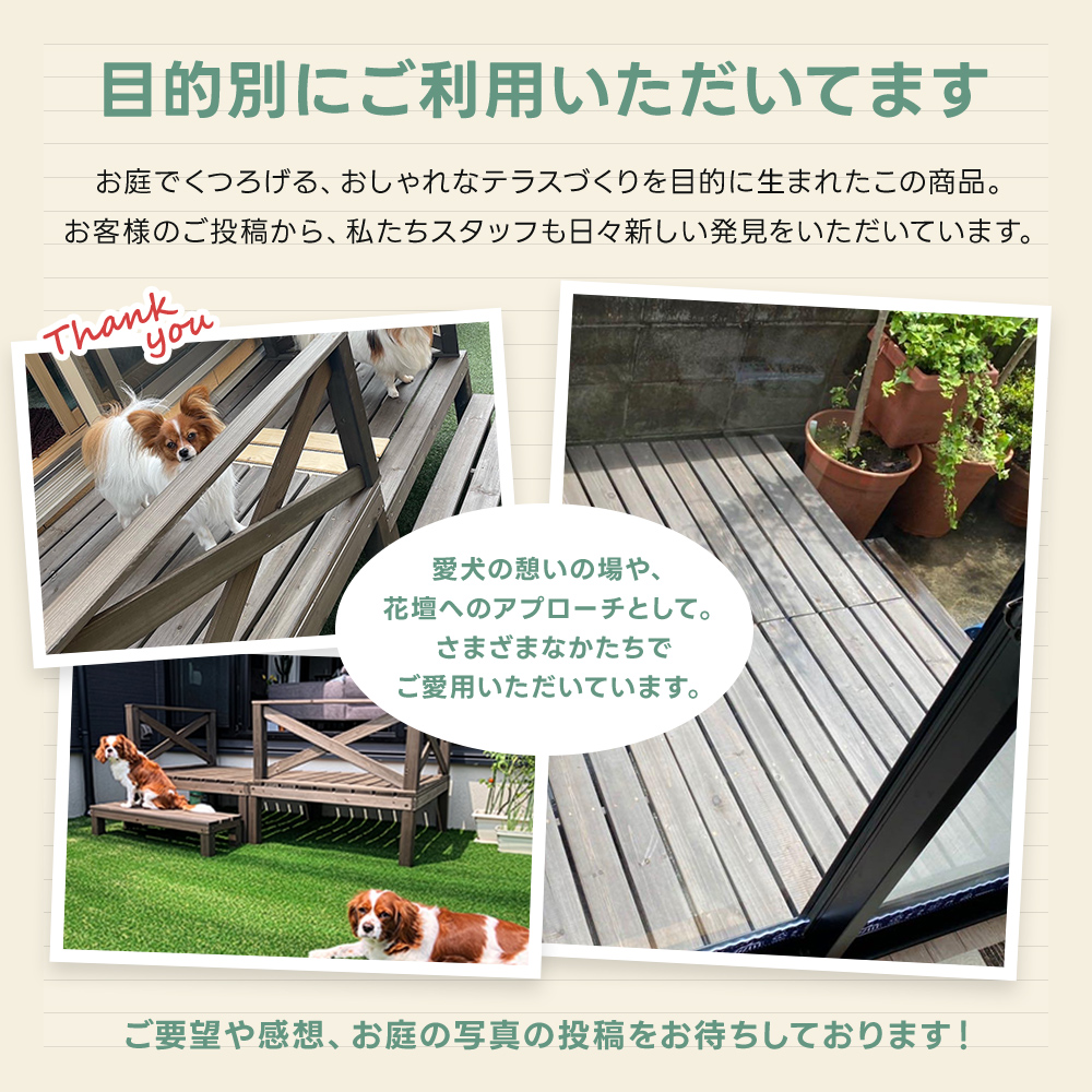 本セットをご利用いただくと1枚目の画像のようなウッドデッキの設置が可能です☆