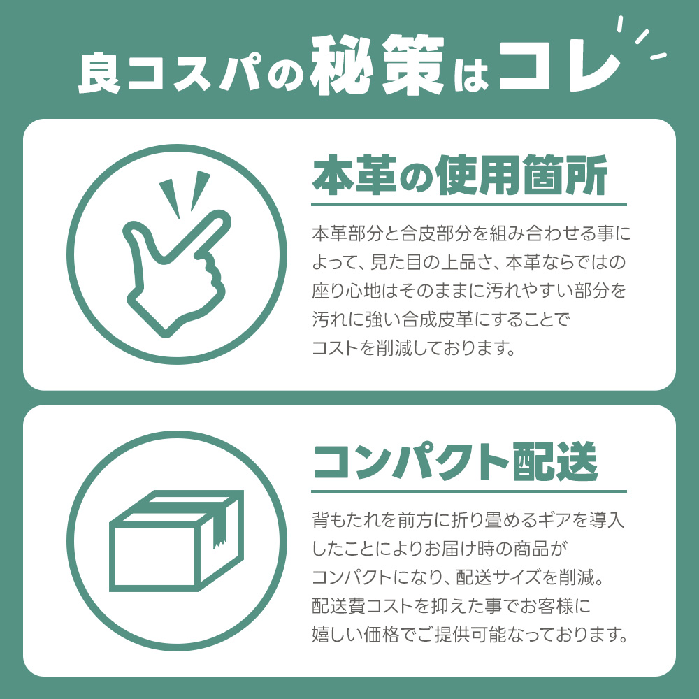 [張り材] 背部、座面:皮革(牛革) / その他:合成皮革、ポリエステル