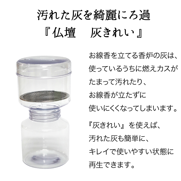 組み立て式の香炉灰(ガラスビーズ用)洗浄キット。汚れた灰をきれいにろ過することで、香炉に残る線香の燃え残りを除去します。水洗いをするので、ガラスビーズを綺麗に洗うことができます。