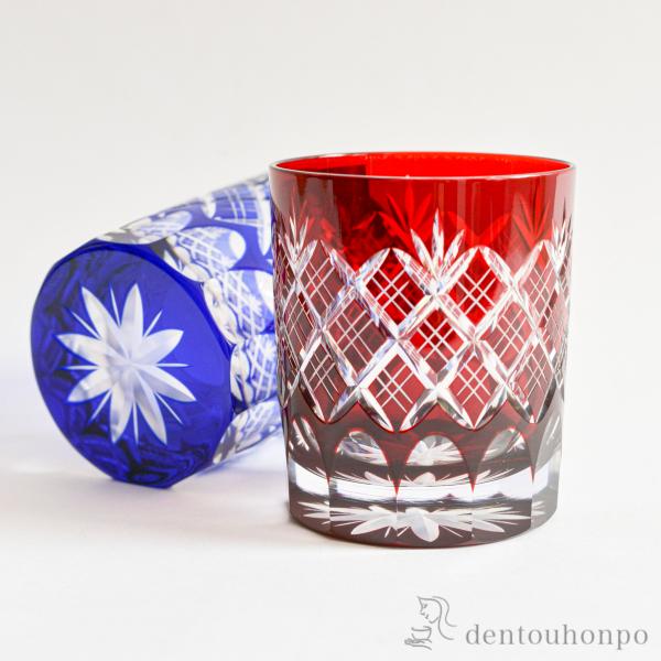切子とは、砥石等の研磨材を用いて硝子器に彫り込まれたカット模様のことです。この技法は、江戸時代の後期より現代に伝えられてきた伝統工芸のひとつです。この硝子器は、江戸硝子吹き技法の色被せ硝子に、切子師の技が光り輝く手造りならではの工芸品です。
