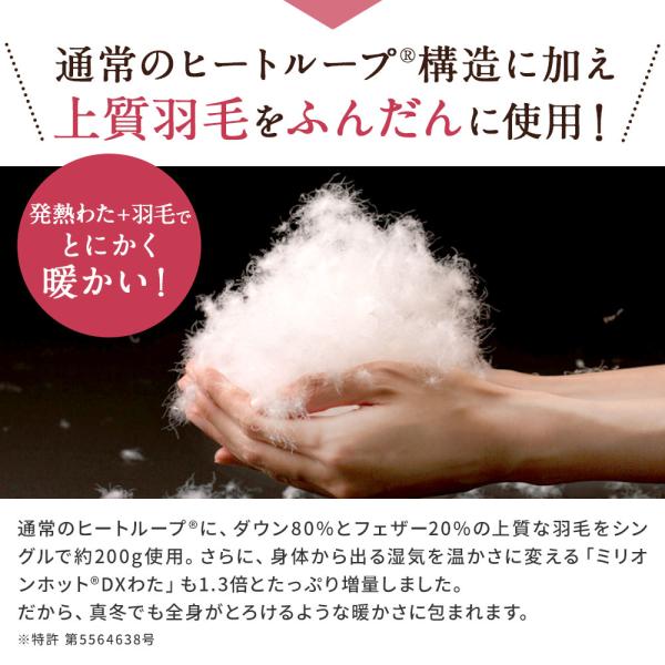 そのヒートループ(R)毛布に羽毛を入れて、なんと掛け布団にしたのがこのアイテム。シリーズ史上最も暖かい※から、真冬でもコレ1枚でOK。布団に入った時のヒヤッと感がないだけでなく、やわらかな肌触りも気持ちよく朝までぬくぬく。冬場の電気代も節約できそうです。