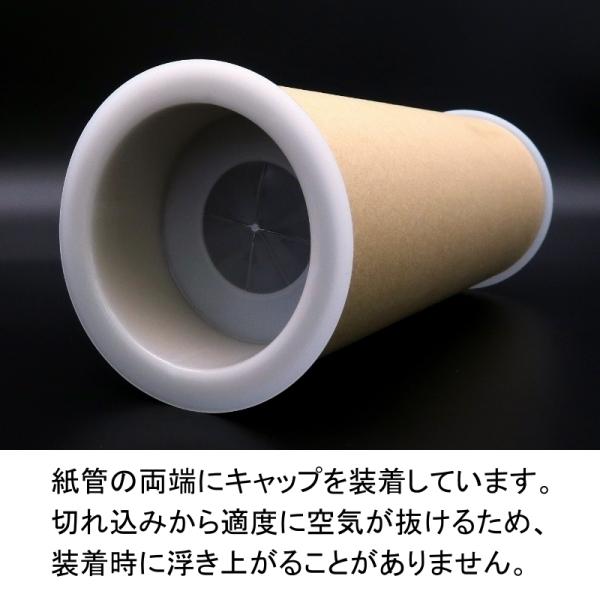 一般的な内径76mmの紙管に適合し、はめた時に空気が抜ける切れ込みが、浮き上がりを防止します。