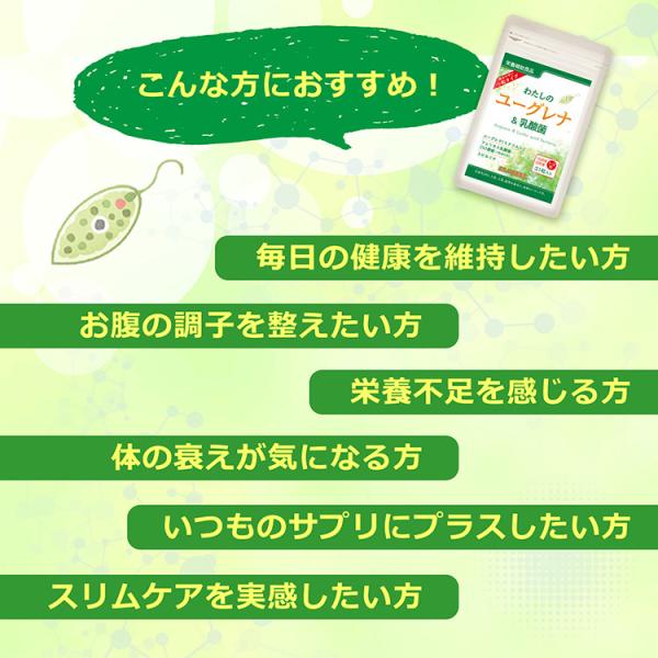 TVでも話題沸騰の「ユーグレナ(和名:ミドリムシ)」。藻の一種であるユーグレナは、植物系栄養素のみならず、魚・肉の動物系栄養素まで含有しており、ビタミン・ミネラル類、各種アミノ酸、EPA、DHAといった不飽和脂肪酸など59種類の栄養素を含んでいます。また、消化吸収を妨げる細胞壁がないため、効率良くこれらの栄養素を摂ることができます。さらに驚きなのは、乳酸菌やビフィズス菌などの善玉菌を増やすチカラを持っている点。豊富な栄養パワーと善玉菌サポートパワーで、健康・美容・スタイルケアを力強くバックアップしてくれる、まさにマルチな能力を持つ自然素材として脚光を浴びているのです。そんなユーグレナを手軽に補えるのが『わたしのユーグレナ&乳酸菌』です。本品には、ユーグレナのパワーを最大限に引き出す善玉菌「フェリカス乳酸菌」を1粒あたり250億個、さらに栄養豊富な「スピルリナ」も同時配合しています。