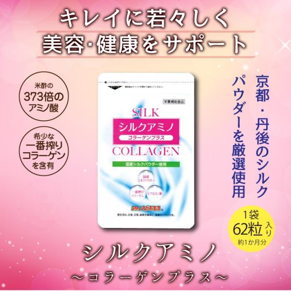 大人気の『シルクアミノ コラーゲンプラス』。結果が第一!という女性たちから、「これほどの実感力は初めて」、「10年前の自分より、キレイに自信!」といった感激の声を続々いただいております。運動燃焼に欠かせないアミノ酸が、なんと米酢の373倍。さらに、シルクに含まれるアミノ酸のバランスは、ヒトのカラダに存在する成分「NMF」の組成バランスと近く、吸収力は折り紙つき。また、プレミアムな美容成分「一番搾りコラーゲン」、「ヒアルロン酸」をプラス。一番搾りコラーゲンは、通常数回行うコラーゲン抽出の際に、一番最初に溶け出した高純度の成分のこと。グレードとしては最高ランクを誇る、特別なコラーゲンです。1グラムで6リットルもの水を抱え込むといわれる「ヒアルロン酸」との相乗パワーで、うるおいにあふれる毎日へと導きます。スマートライフとビューティアップを同時にサポートできるパワーを、ぜひ実感してください。