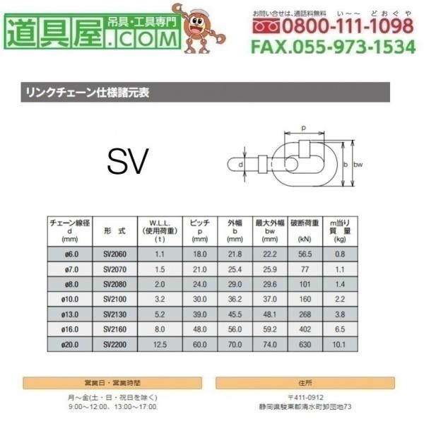 ■【メーカー】:(株)キトー■【型番】:SV2080■【仕様】●チェーン線径(太さ):8mm●メートル単位での販売●使用荷重:2.0ton●1Mの質量:1.4kg■【納期】:通常翌日〜4日発送