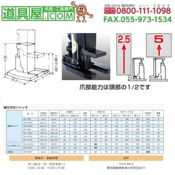 ■【メーカー】:(株)ダイキ■【型番】:DH-5LEN■【仕様】●爪ロングタイプ●爪部寸法:長さ80mmX幅75mm●ストローク130mm●爪部最低位置25mm●頭部能力10T●本体高さ283mm●油圧爪つきジャッキ爪部能力5T■【納期】:お取り寄せの為、入荷次第に発送