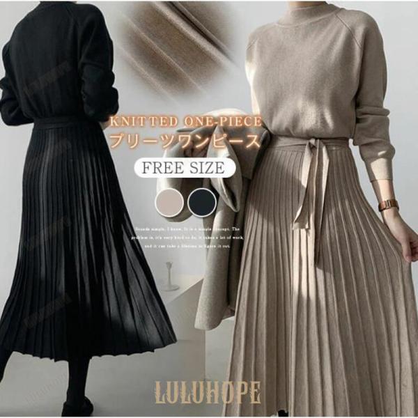 ニットワンピース 秋冬 大人 長袖 きれいめ ロングワンピース プリーツ ワンピース フレア プリーツワンピース ニット大人 おしゃれ ワンピ 黒