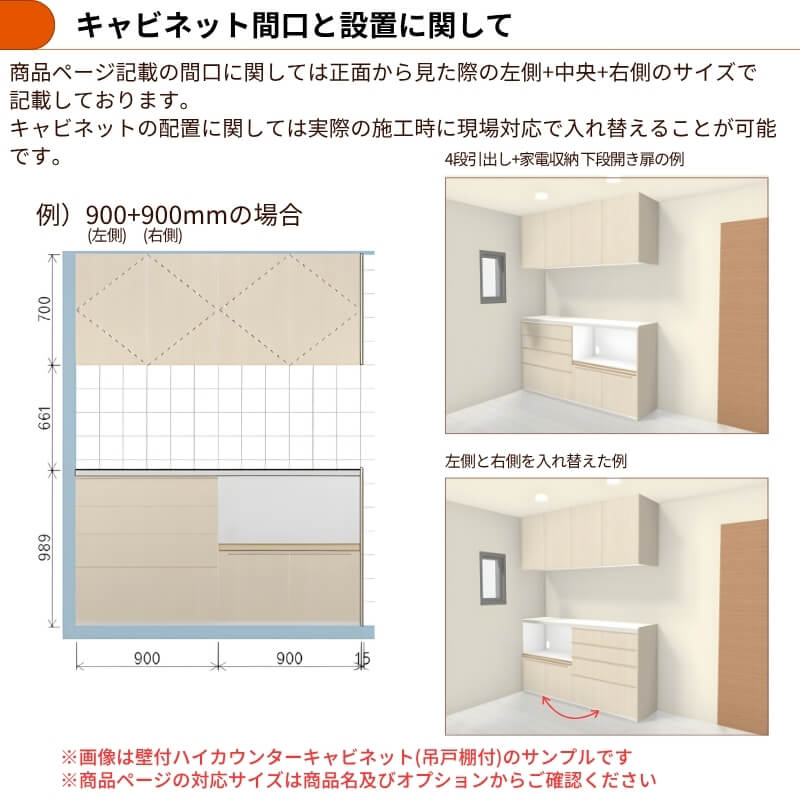 豊富な種類やサイズのキャビネットなどを組み合わせることで、設置スペースの広さや高さに合わせて機能的な住宅設備としてのキッチン収納を作ることができます。