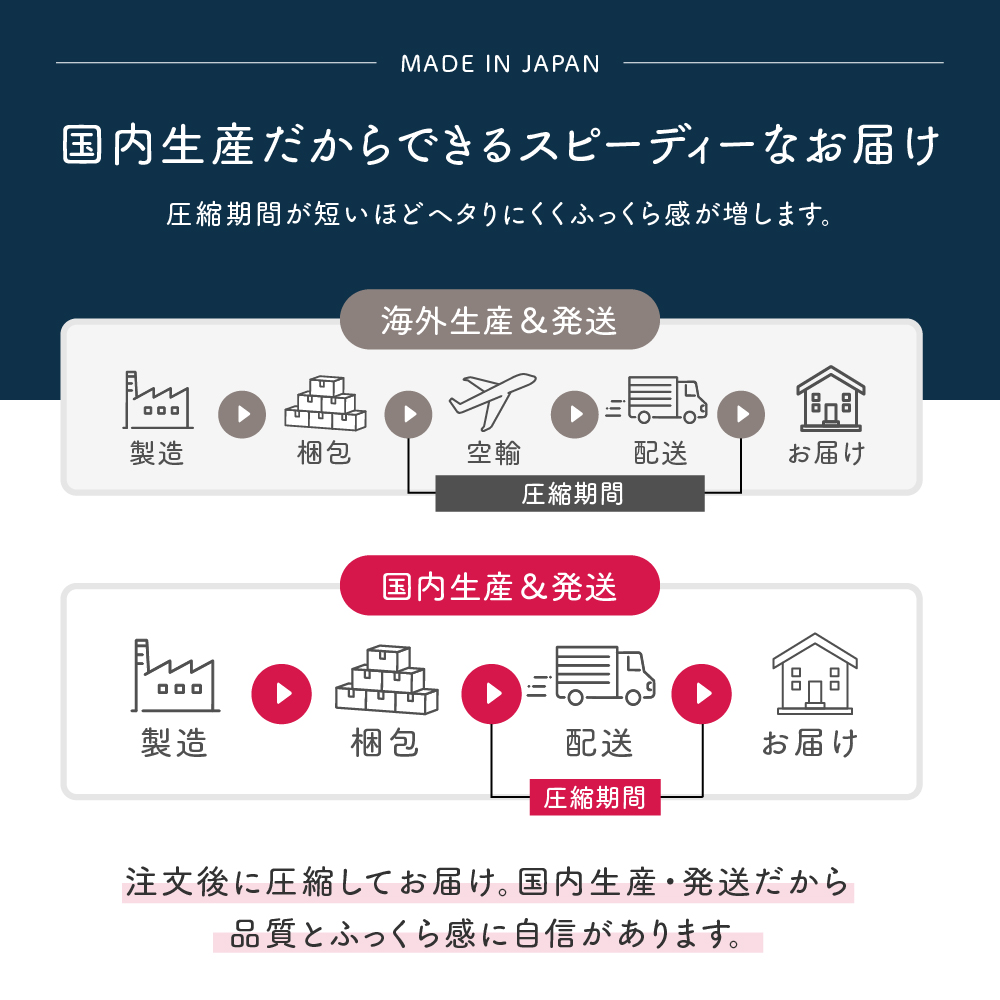 国内工場から直接配送されます。海外発送より圧縮期間が短く、開封後すぐにふっくら感を実感できます。
