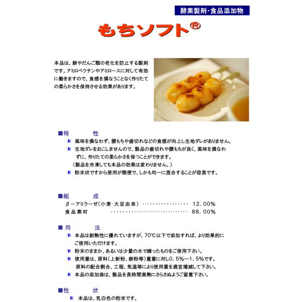 もちソフトは餅やだんご類の老化を防止する製剤です。