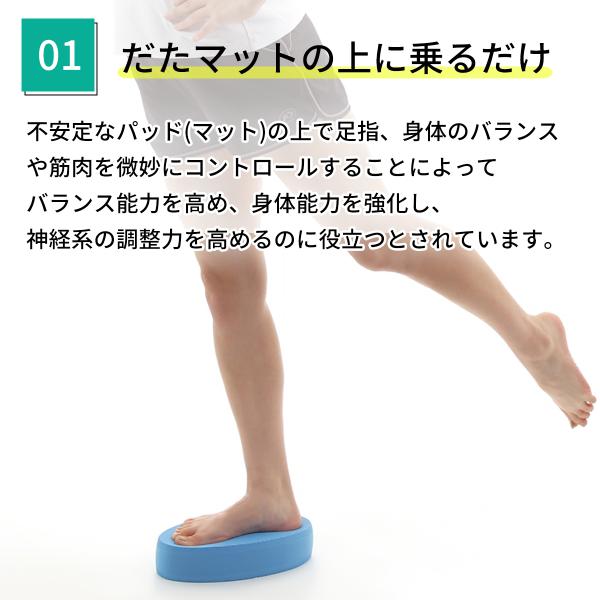不安定なパッド(マット)の上で足指、身体のバランスや筋肉を微妙にコントロールすることによってバランス能力を高め、