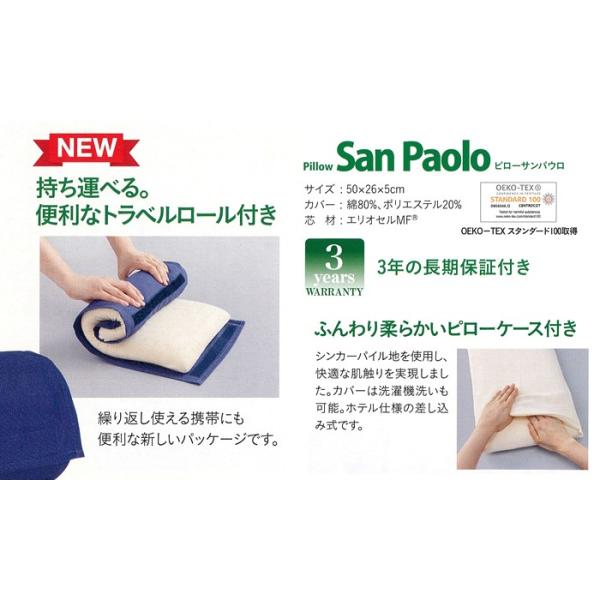 *ポイント倍付け対象外商品。ピローサンパウロ。フラットタイプがキュートなサイズで登場! 小さくて扱いやすい。低め薄型コンパクトサイズのピローです。ピローグランデの熟睡性能をキュートに実現しました! ボディ全体に設けられた200個ものエアホール。芯材には独自に開発した最上質高反発素材エリオセルMFを採用するなど、マニフレックスならではの熟睡仕様で、同時にどなたにも使いやすいコンパクトサイズを実現しています。◆低めのコンパクトな薄型タイプ。旅行用や子ども用にもおすすめ!メーカー保証書付きで安心。ギフトにも最適です。 詰めもの部分:イタリア製、カバー部分:中国製、トラベルロール:日本製。●長期3年保証。… /サイズ:50×26cm H5cm、約600g(シンカーパイルカバーを含む)、トラベルロール65×29cm、(箱寸:約33×15.5×16.3cm、840g)、メーカー保証3年間/生地・素材:カバー素材:綿80%・ポリエステル20%(シンカーパイル地)・アイボリー色、トラベルロール素材:ポリエステル100%/:枕芯材:エリオセルMF(ポリウレタンフォーム)、保護側地(綿50%・ポリエステル50%)、約0.51kg