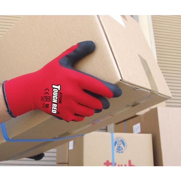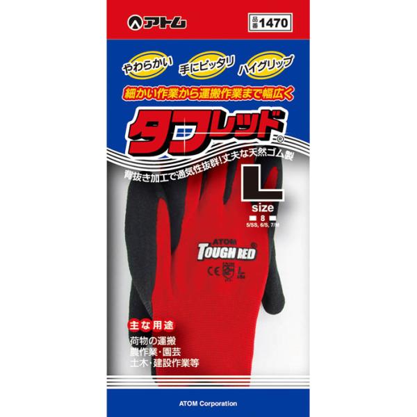 作業手袋 スベリ止め グリップ 天然ゴム製背抜き手袋 No.1470 タフレッド 1双単位 Lサイズ レッド 赤 ブラック 黒 Atom 通気性 フィット 耐久性