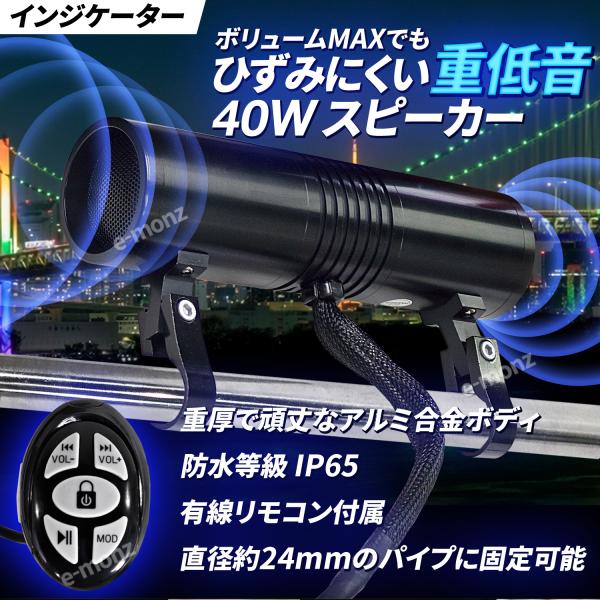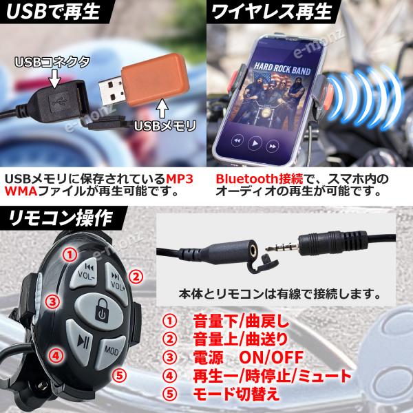バイクでも音楽を!Bluetooth対応でワイヤレスでも、USBメモリでも再生できる!重厚なアルミ合金のボディーは大音量でも大音量でも音割れしにくいミュージックプレイヤーです。