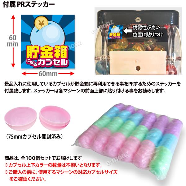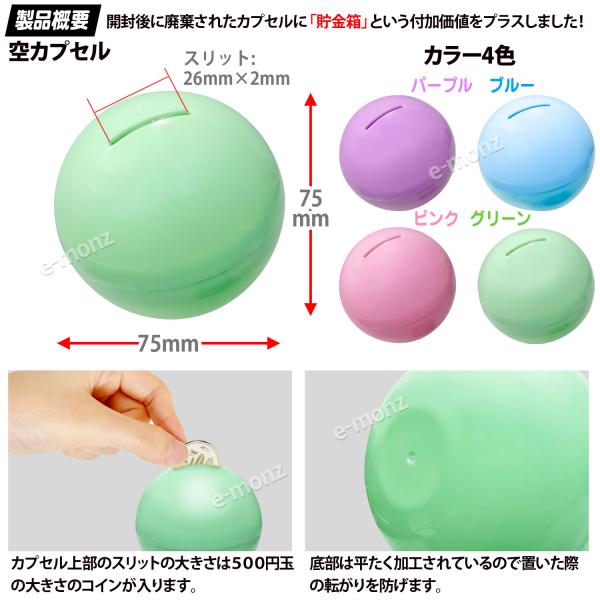 なんと貯金箱になる空カプセルで景品としての価値もUP!直径75mmサイズでカラーは4色入りです!PRステッカーも付属!