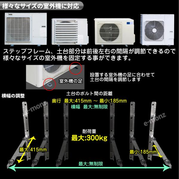 室外機の足の位置に合わせてアームフレーム土台の前後幅を調整できます。アーム同士が独立したタイプですので、室外機の横幅のサイズに制限はありません。奥行は、最大:415mm ? 最小:185mm 範囲の幅を可変させる事が可能です
