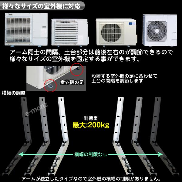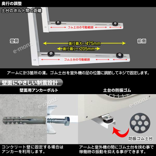 室外機の足の位置に合わせてアームフレーム土台の前後幅を調整できます。アーム同士が独立したタイプですので、室外機の横幅のサイズに制限はありません。奥行は、最大:475mm ? 最小:205mm 範囲の幅を可変させる事が可能です。