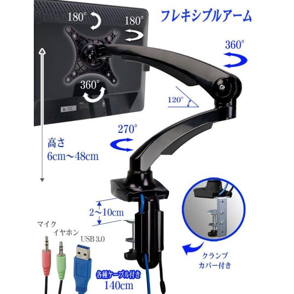 モニターアーム アームスタンド ディスプレイスタンド モニタースタンド 縦モニター モニター回転 ヘッドセット端子 USB3.0 VESA クランプ フレキシブル 水平垂直可動 ケーブル PC 液晶 モニター ディスプレイ パソコン ゲーミング オフィス テレワーク リモートワーク オンライン Eスポーツ