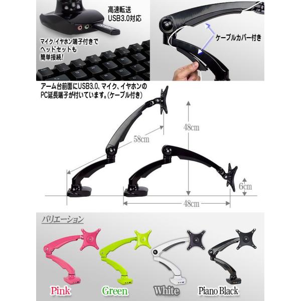 カラフルなパソコン用モニターアームスタンド!全4色ともにUSB、イヤホンマイク端子付きで実用的なフレキシブルアーム
